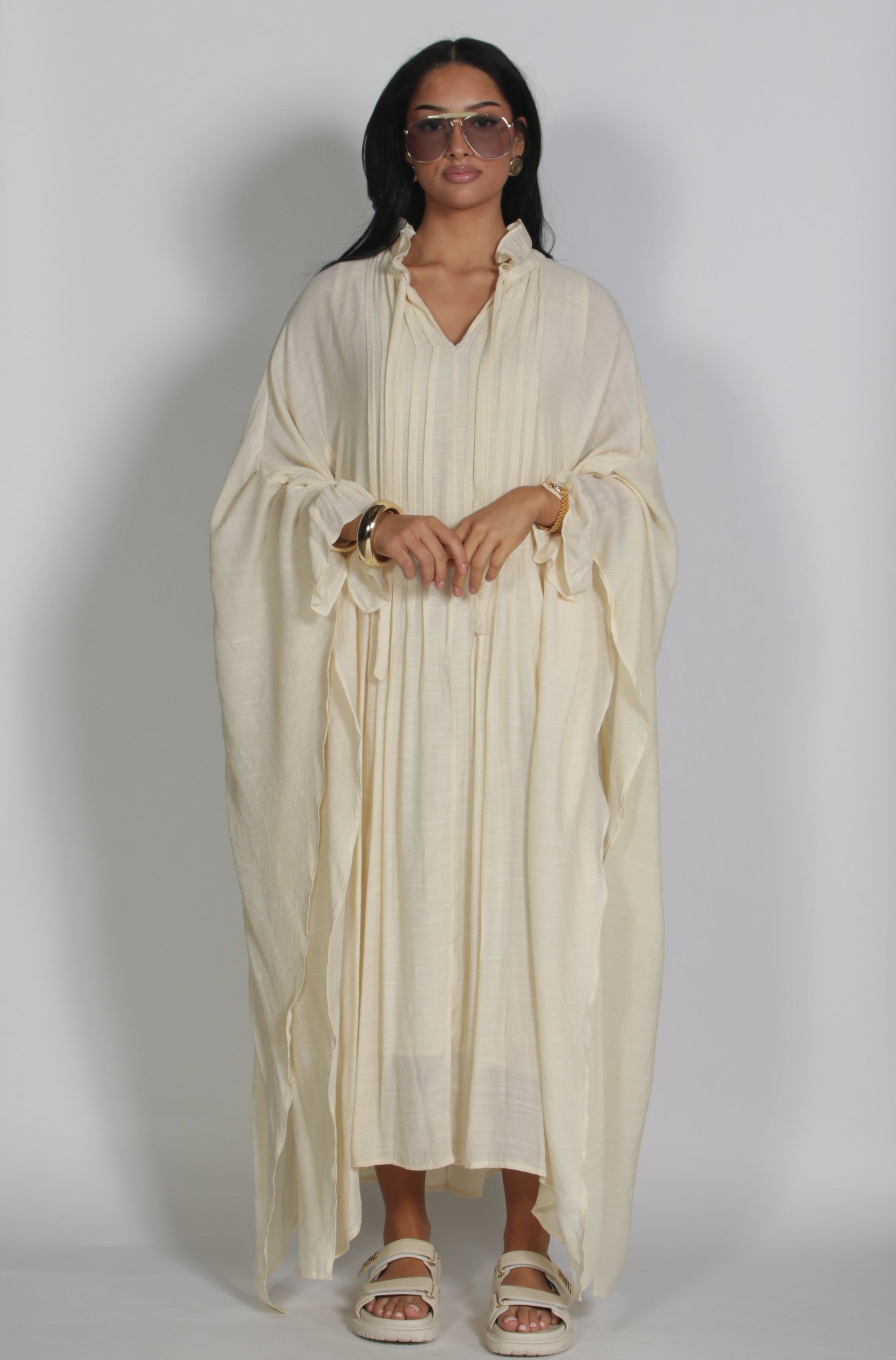 Het model is 1.65 lang en draagt de Paris dress in maat S/M.