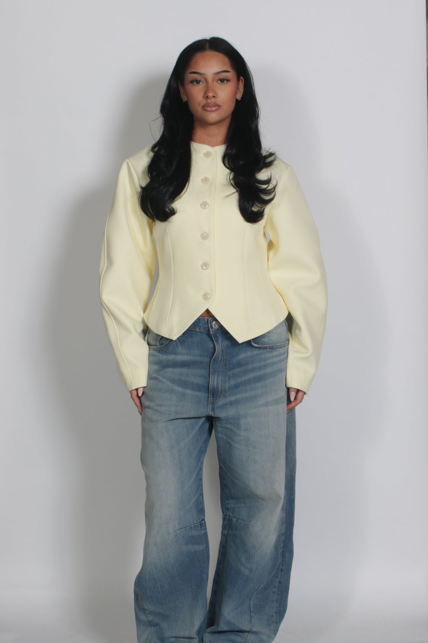 Het model is 1.65 lang en draagt de Grace blazer in maat S.