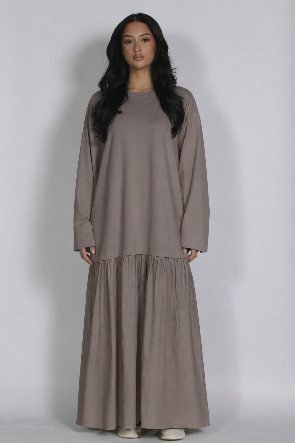 Het model is 1.65 lang en draagt de Mika longsleeve dress in maat One size. Lengte: 137 cm
